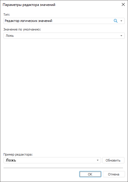 По аналогии с переключателем редактор логических значений принимает только 2 значения: «Истина» и «Ложь», однако выбор значения производится из раскрывающегося списка: