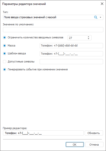 Поле ввода строковых значений с маской позволяет ограничить набор доступных для ввода символов и задать формат вводимого значения (или шаблон). Данный тип редактора может использоваться для ввода номеров телефонов, почтовых и других индексов, идентификаторов и др.