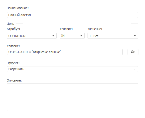Политика содержит правило, разрешающее полный доступ к объектам со значением «открытые данные» пользовательского атрибута «ATTR». Условие полного доступа задается с помощью атрибута среды окружения «OPERATION».