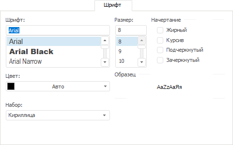 Набор. Задаёт набор используемых символов, поддерживаемых выбранным шрифтом. Параметр присутствует при настройке шрифта в регламентном отчете;