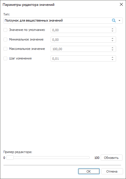 Данный тип редактора позволяет задавать значения вещественного типа с помощью ползунка: