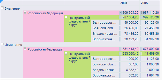 Рассмотрим область данных, для которой включено произвольное размещение, заданы дополнительные наименования элементов измерения, для заголовков и данных элементов заданы идентичные оформления: