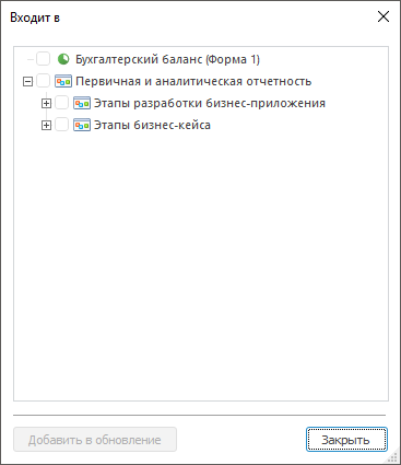 Примечание. Команды «Состоит из» и «Входит в» доступны только при создании обновления и недоступны при открытии уже созданного обновления.