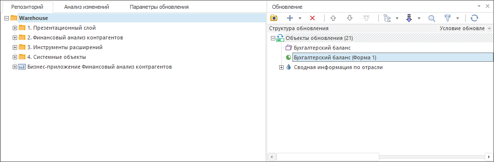Объекты репозитория с вкладки «Репозиторий» будут добавлены на панель «Обновление» после выделенного объекта, в выделенную папку или в конец иерархического списка.