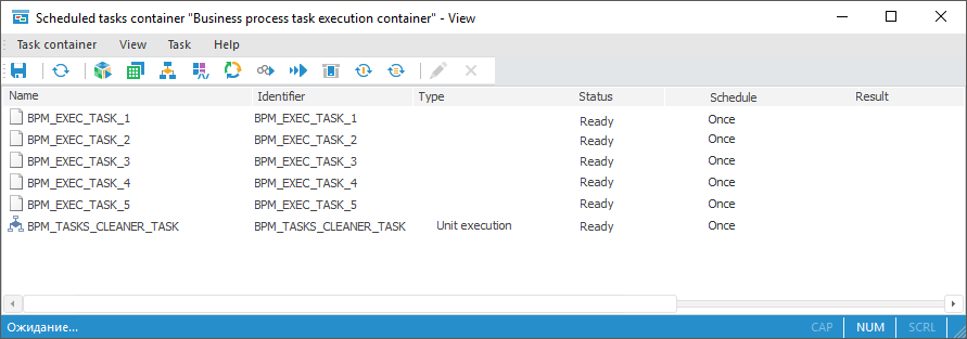 NOTE. If scheduled tasks container with the BPM_EXECUTOR_CONTAINER identifier is absent or empty, then select the Initiate Task Container item on the Debug page of the Setting Up Parameters and Administrating Business Processes window.