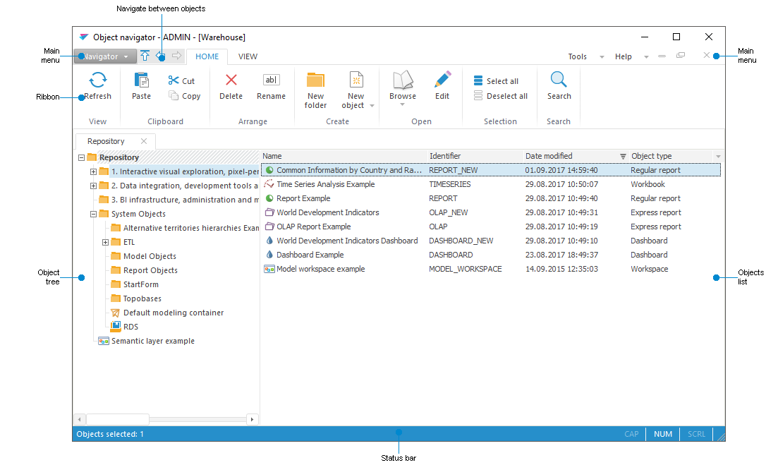 Object navigator is a tool that used to visually present a repository and to work with its objects.