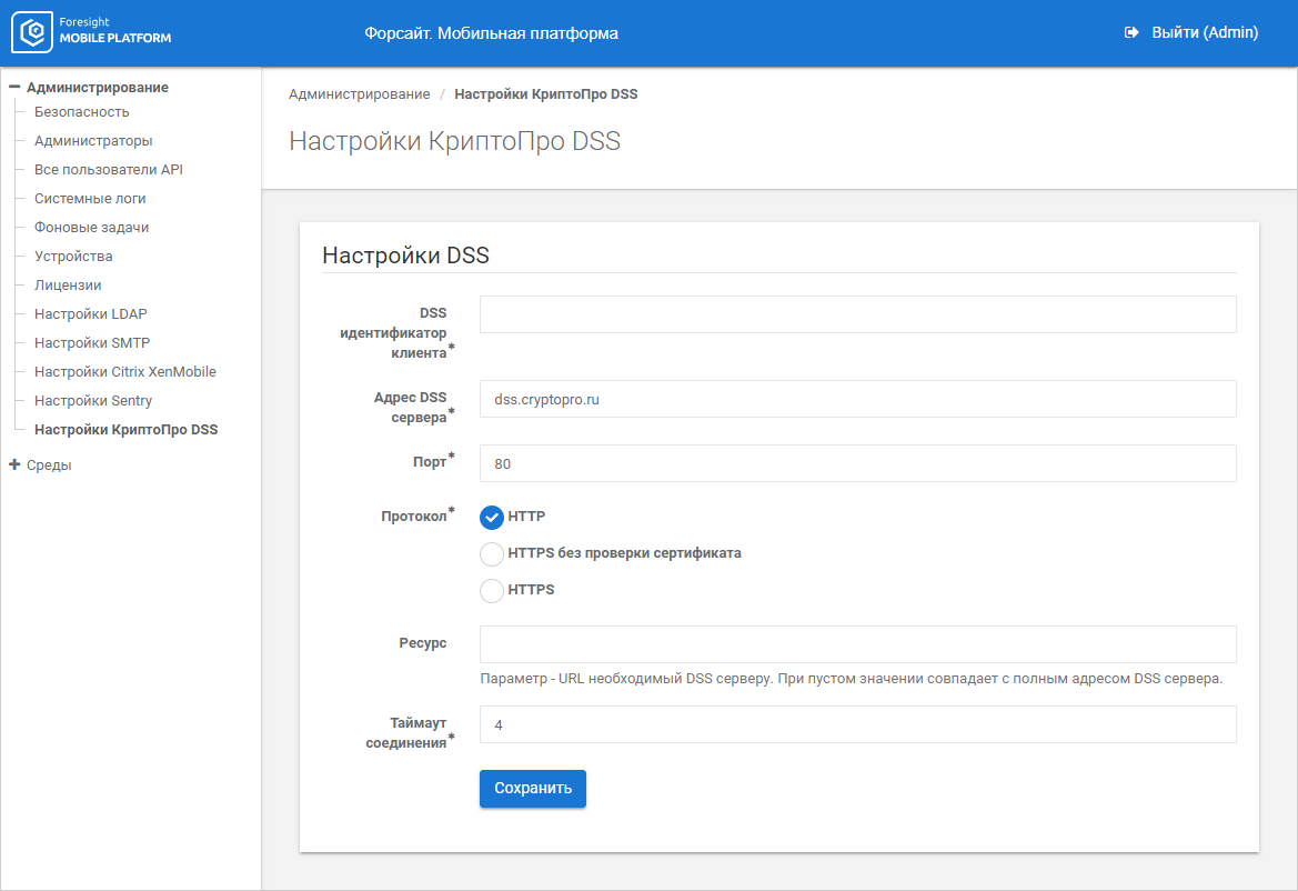 Client DSS ID. Specify client identifier in the CryptoPro DSS system. The box is mandatory.