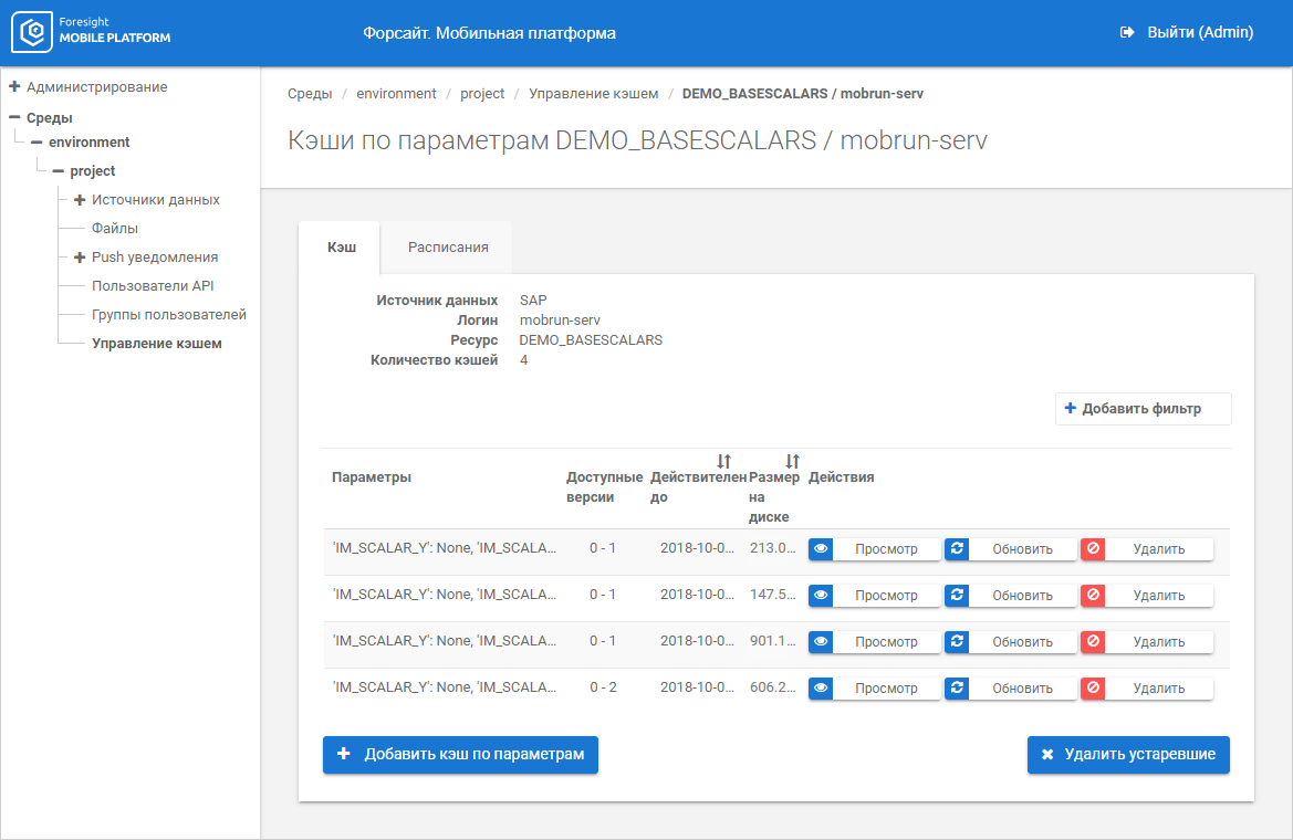 To view saved caches by parameters for a specific resource, click the View button next to resource name in the caches list. A list of caches by parameters opens for the selected resource:
