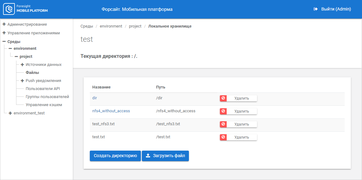 To delete a file or directory with nested files from the current directory, click the Delete button next to the file or directory name.