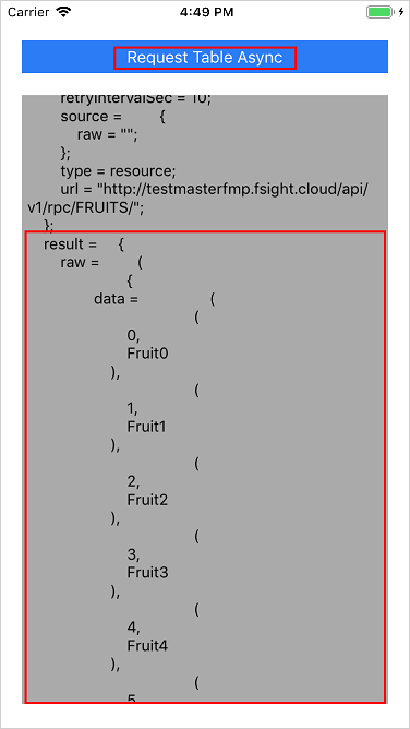 To execute the example, click the Perform Table Async button. Clicking the button initializes an asynchronous request to resource. The mobile platform server returns corresponding table data without loading to database.
