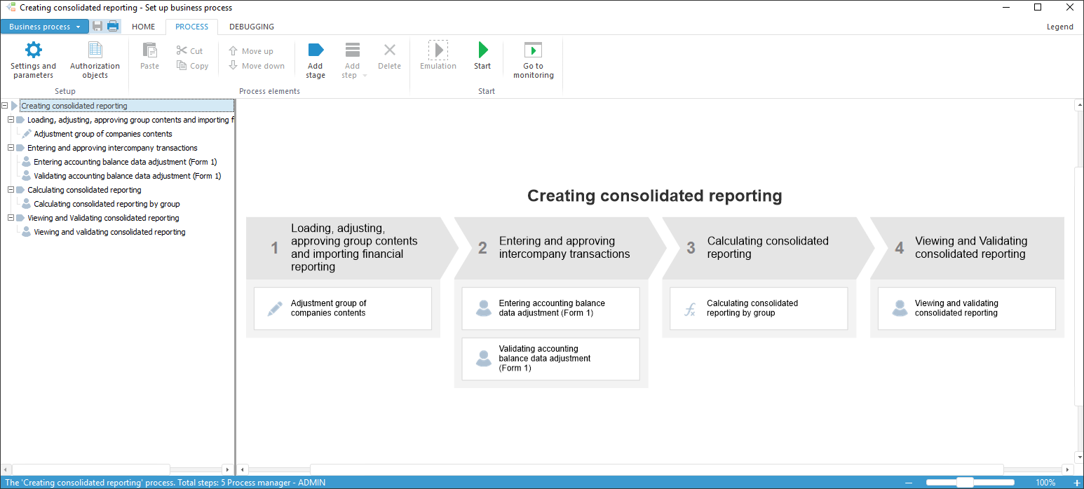 A business process is executed in several stages, each of them contains steps. These steps are used to load, enter and correct data via special forms, calculations and calling specific factor calculation algorithms, and also consolidation and validation of a specific dataset of the entered or corrected dataset in the data entry form.