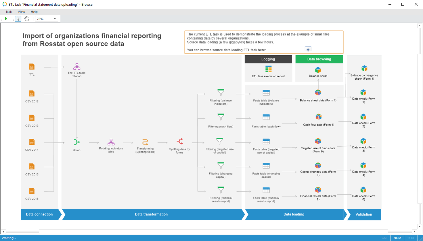 To import and export data with the ability to set up relations between data sources and data consumers and also intermediary data transformations, the ETL Task tool.
