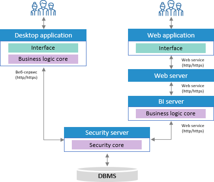 Foresight Analytics Platform desktop application connects via web service to the security server and passes identifier of the required repository set up in the security server. Then all requests from Foresight Analytics Platform desktop application to database pass via the security server that forms database requests. On using the web application the BI server used as a business logic core is added to configuration.