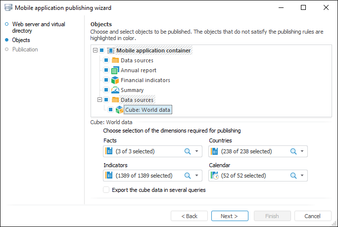 By default, the selection in cube dimensions or a time series database corresponds to the selection in all dimensions of reports included in the published mobile application container. If required, change the selection of dimensions elements.