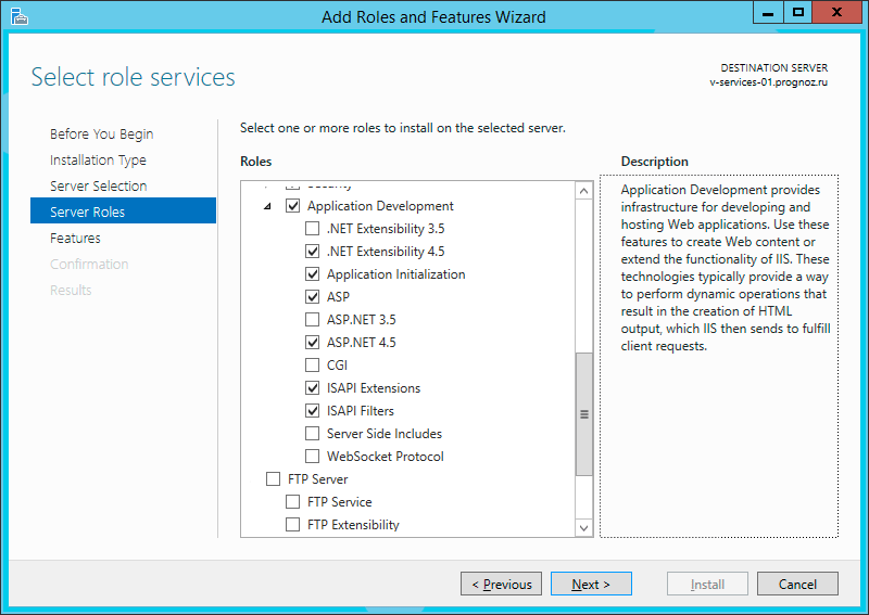 1. In the server manager go to the All Servers tab. In the Servers section execute the Add Roles and Features context menu item for the required server in the list. The add roles and features wizard opens. Go to the Server Roles tab and select the Web Server (IIS) checkbox. A dialog box opens where the user needs to confirm adding the feature. Click the Add Feature button: