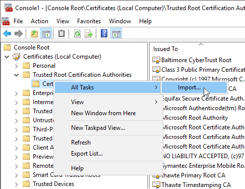Import the obtained certificate to the Trusted Root Certification Centers > Certificates folder: