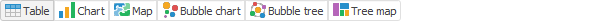 Map. It is based on a two-dimension table and usually consists of one row or column from this table as territory fill. Territory fill is determined by start and end colors, which correspond to minimum and maximum values on the map. Colors of intermediate values are calculated automatically.