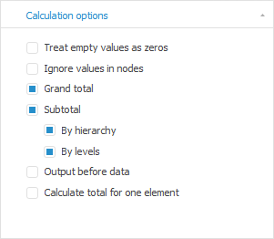 To display totals by hierarchy or by levels, select the Calculate Hierarchy Totals or Calculate Level Totals checkboxes.