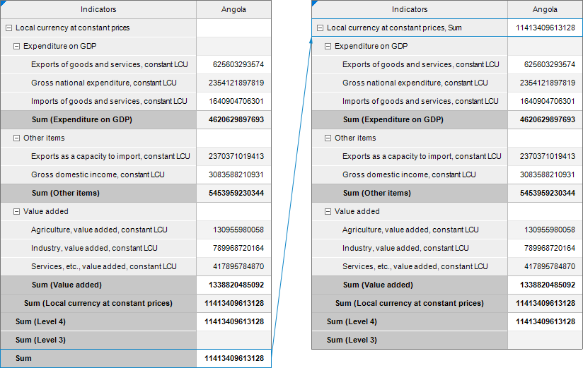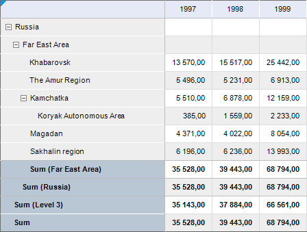 To set up display parameters of totals in the parent element string, select one or both checkboxes. The setting is separate for row and column totals.
