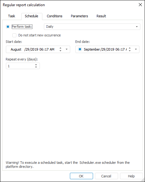 Do not Start New Occurrence. Selecting this checkbox enables the user to avoid simultaneous occurrences of the same task: the task is not started until the previous occurrence of this task is completed. If one or several scheduled task's starts have been skipped, they are executed in turn.