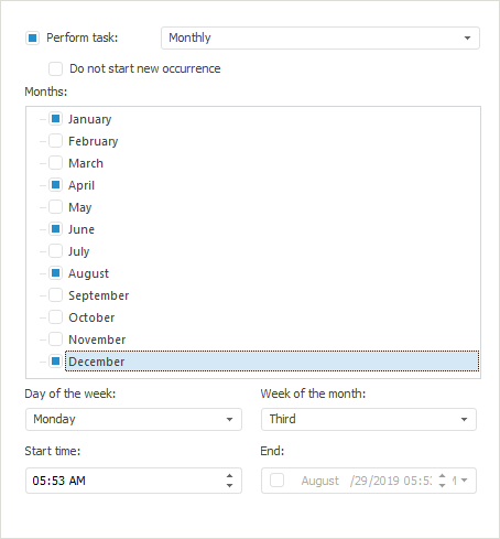 End Date. Selecting this checkbox enables the user to set time and date of the last task execution, when they are reached, the task will be no more executed. By default the setting is deactivated.