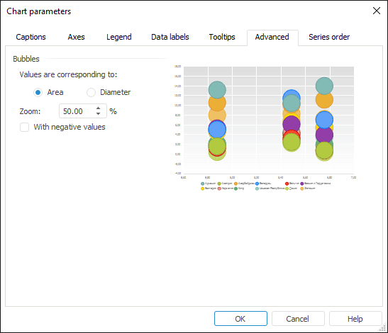To set up additional parameters of mixed, pie, doughnut, waterfall charts, histogram, histogram with fluctuation intervals and bubble chart, go to the Advanced tab of the Chart Parameters dialog box.