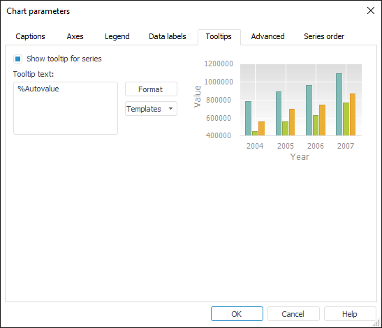 To set up tooltips for data points, go to the Tooltips tab of the Chart Parameters dialog box.
