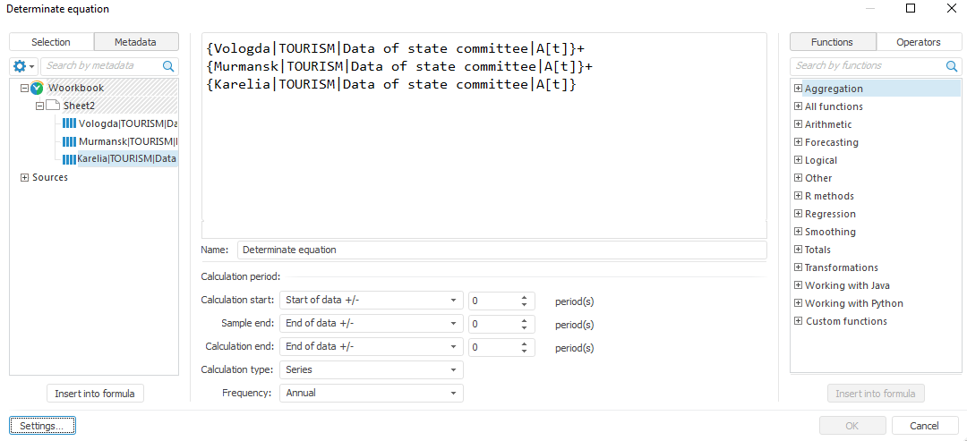 After the method is applied the expression editor opens, which is used to create a calculation formula for calculated series. For example:
