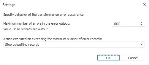 To set additional settings to be applied when there are error records, click the Settings button. The dialog box opens: