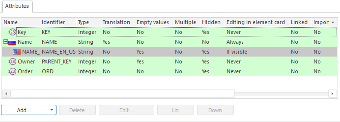 Initially the table contains only the column with attributes names for current default repository language. It is in bold.