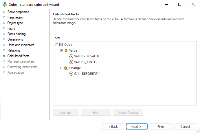 - facts not linked to data set fields. A formula, by which values can be calculated, can be determined for them. After the formula is specified, facts' markers change to