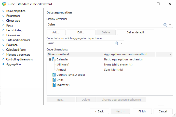This page is used to set up display versions and aggregation for cube dimensions. A detailed description of setting up various aggregation mechanisms is given in the Aggregation by Dimension Levels section. Disaggregated data is extracted on opening the cube. Data is aggregated in the opened cube in the client workstation.