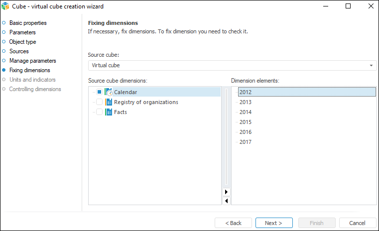 Virtual Cube. The cube is created using the other cube data. A cube fact dimension is created on the selected elements of fixed dimensions. When viewing virtual cube data in an express report, the dimensions panel shows non-fixed common dimensions of source cubes and the dimension of virtual cube facts.