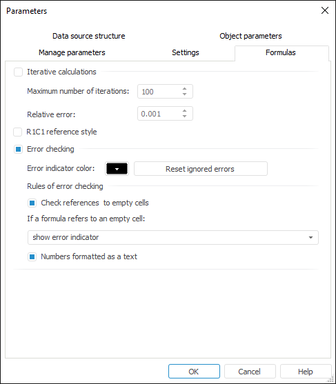 Error Checking Options. The command opens the Report Parameters dialog box on the Formulas tab.
