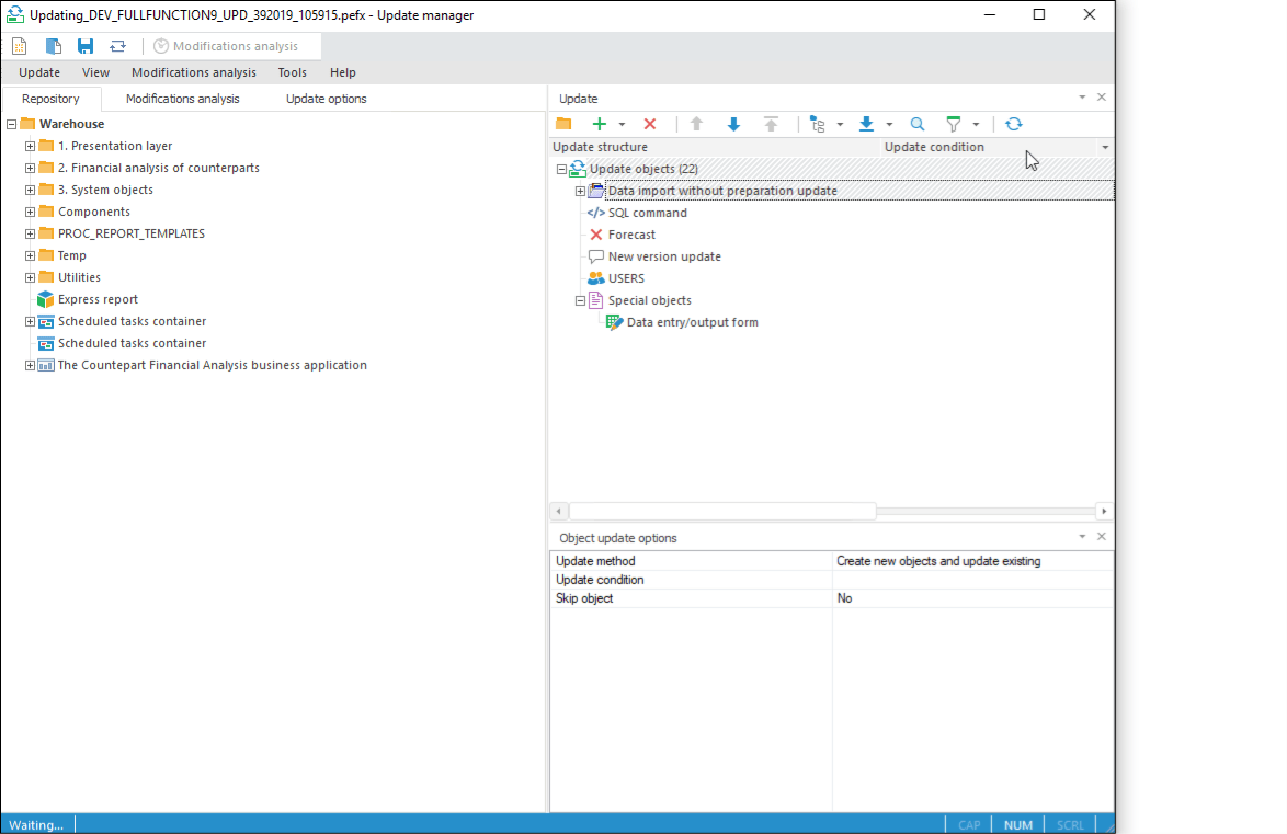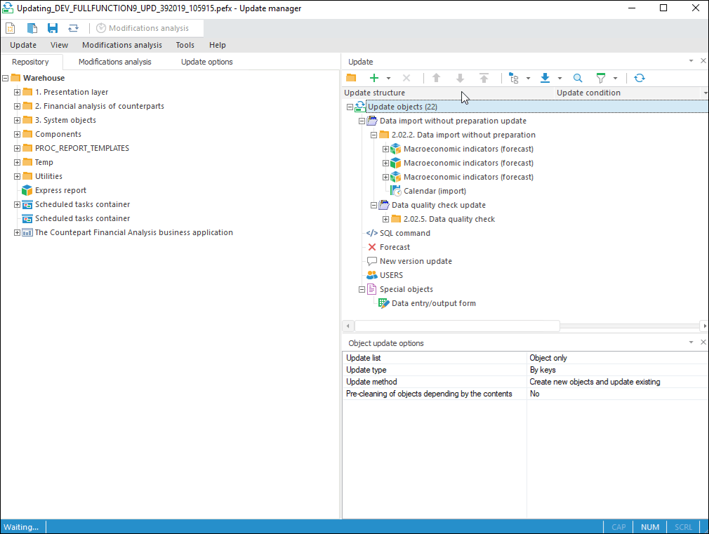 To create an update, open the repository as an administrator who is responsible for synchronization of objects between repositories or application systems synchronization of Foresight Analytics Platform developers and end users, or under the account of Administrators group member account.