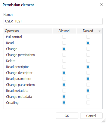This dialog box displays the name of the selected subject of the security model and a list of detailed permissions for certain object types. To allow or deny executing specific actions on an object, select corresponding checkboxes next to the required operations.