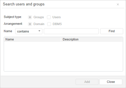 For details about how to work with dialogs of domain user group selection, go to the Selecting Users and Groups section.