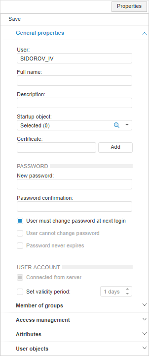 To change parameters of general user properties, use the General Properties tab in the User Properties dialog box in the desktop application and on the Properties side panel in the web application: