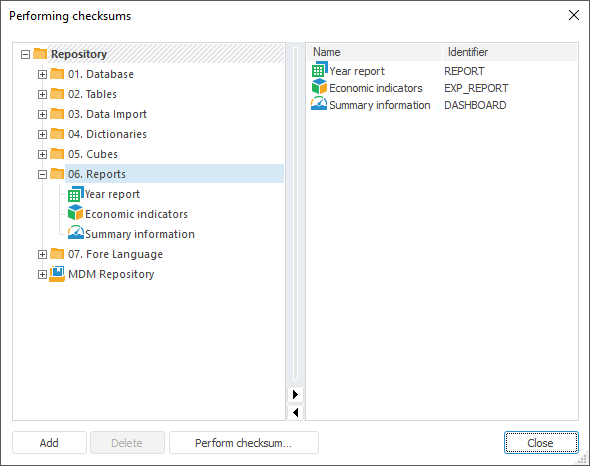 NOTE. The list of objects for checksum performing is created in the right dialog box part. If the dialog box was opened in the update manager, the right part of the dialog box displays the objects contained on the Update panel.