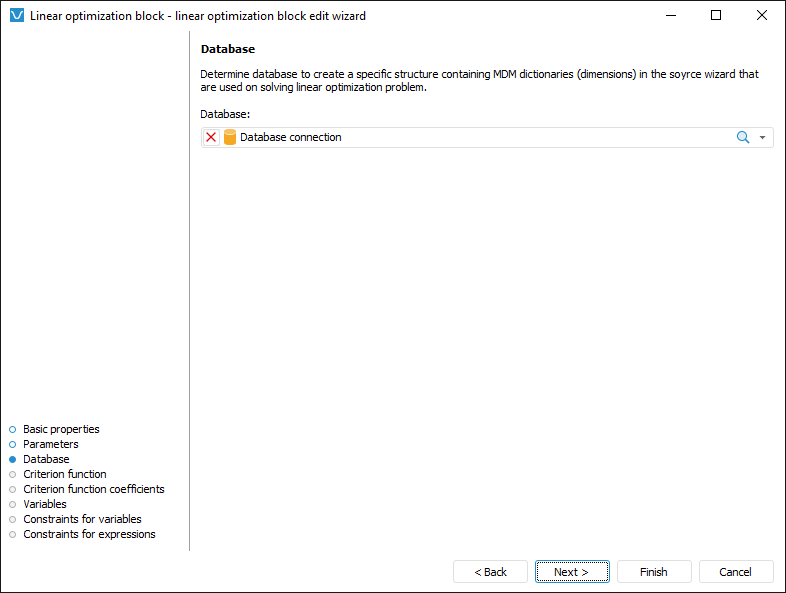 In the Database drop-down list select the database that will be used by linear optimization block. If a database is set in the repository used by default, it is selected automatically.
