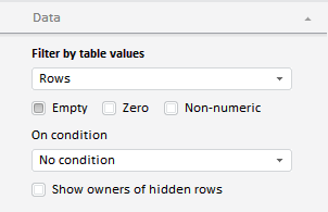 Executing the example requires that the HTML page contains the ExpressBox component named expressBox (see Example of Creating the ExpressBox Component). By default the Filter by Table Values section in the Data tab of express report properties panel looks as follows: