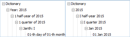 After executing the example various formats of displaying element names are set for calendar dictionary at different levels (left), which differ from the standard ones (right):