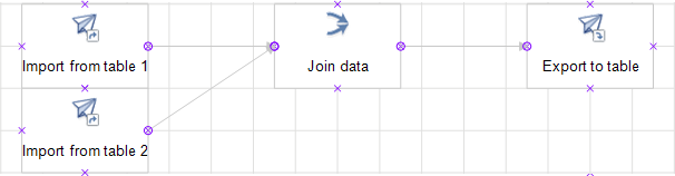 Three tables must be in the repository: T_SourceOne, T_SourceTwo and T_Destination. Structure of sources must be identical and must contain the ID and VALUE fields. The structure of consumer must contain the ID, VALUE1 and VALUE2 fields. The repository must also contain an ETL task with the ETLTASKS identifier. On executing the example presented below four objects are created in the ETL task: two repository sources, the Join converter and a repository consumer. The required properties and links are set for all objects: