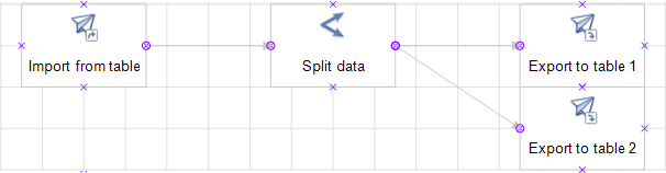 The repository must contain three tables: T_Source, T_DestinationOne and T_DestinationTwo. Tables must be identical in structure, there is a field with the ID identifier, records are split by values of this field. The repository must also contain an ETL task with the ETLTASKS identifier. On executing the example presented below four objects are created in the ETL task: repository source, the Split transformer and two repository consumers. The required properties are defined for all objects, links are set, split conditions and linking of consumers for each condition are set: