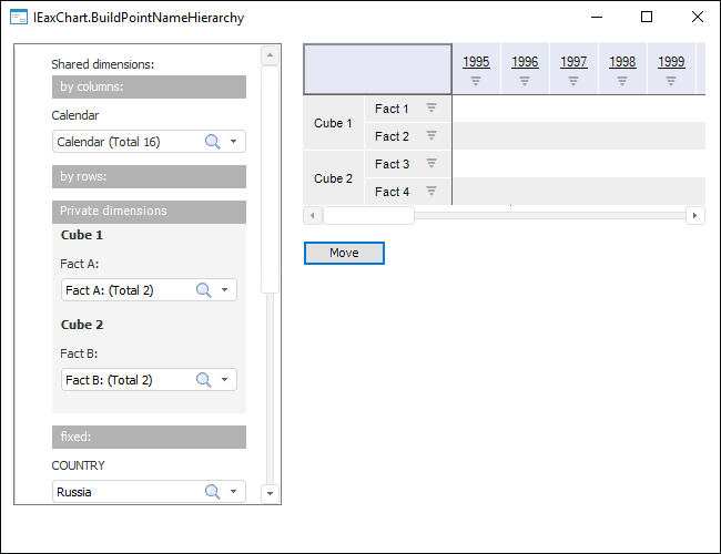 Executing the example requires a form with the Button1 button, the TabSheetBox, ErAnalyzerDimPanel component and the UiErAnalyzer component named UiErAnalyzer1 that is a data source for the mentioned visual components. For the Fore.NET Example - existing of the .NET form and similar .NET components. An express report built on several sources is connected to UiErAnalyzer1. A dimension with the Country identifier is among shared dimensions.