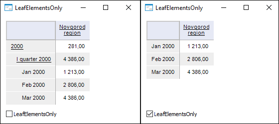 The LeafElementsOnly property determines whether it is necessary to place only leaf elements in the report (elements without selected child elements).