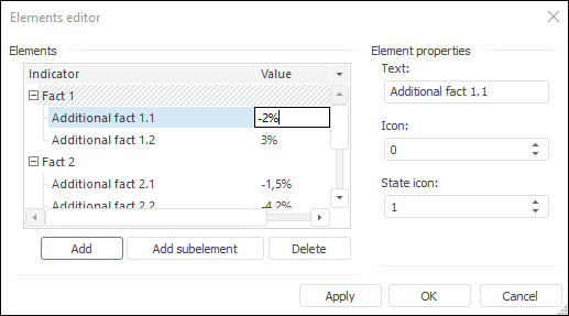 Each element can contain text, icon, and state icon. If the component contains more than one column, make single mouse button click on the intersection of the selected element and required column to edit the element value in another column. The value edit dialog box opens in a few seconds.
