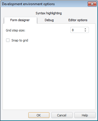 To open the Development Environment Options dialog box, select the View > Development Environment Options main menu item. The dialog box includes four tabs:
