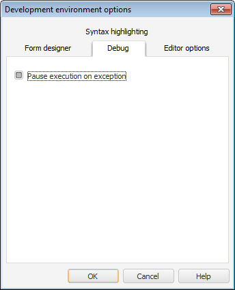 This tab contains settings that determine system's behavior if an exception is thrown when debugging a custom assembly/unit/form.