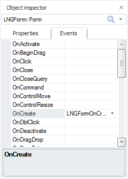 Double-click the cell corresponding to the OnCreate event. An event handler with the LNGFormOnCreate name is created.